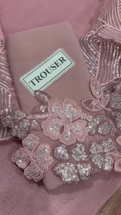 Subtle Glamour for Every Occasion. Is soft mauve color ke chiffon suit mein nihayat nafayast se kaam kiya gaya hai. Iski neck aur sleeves par matching silk threadwork aur delicate stone/sequence embellishments hain jo isse aik dreamy aur soft look dete hain. Ye outfit un logo ke liye perfect hai jo heavy colors ke bajaye elegant aur pastel tones pasand karte hain.